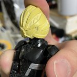 #今週のデザグラずかん 【装動】仮面ライダータブー(cts remix)【改造】 音孤さん(@otoko_to)原案、黒い豚カレーをモチーフに考えたマスクデザインのアレンジを頼まれ、オレが料理したバージョンの顔で立体化。後頭部はサイクルメット。 #ニチアサフィギュア改造部