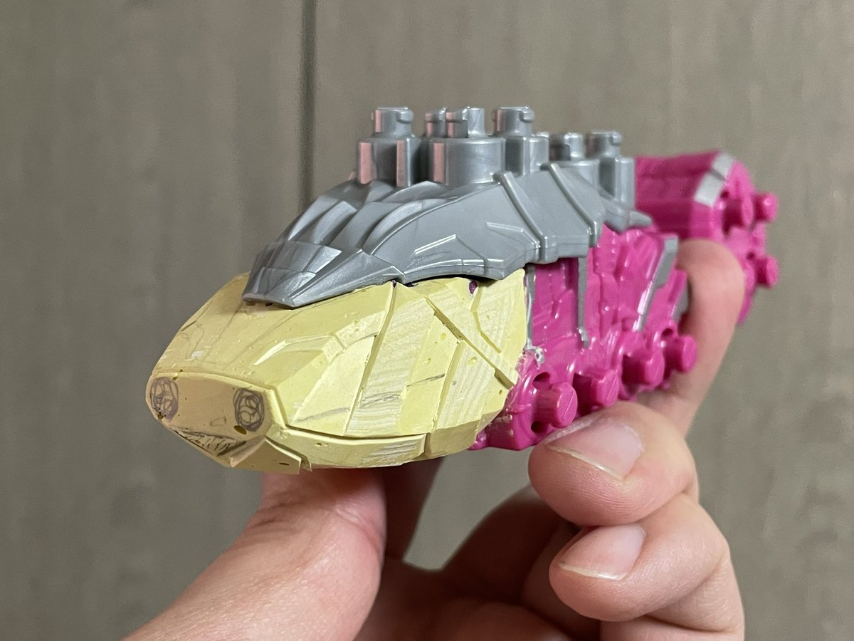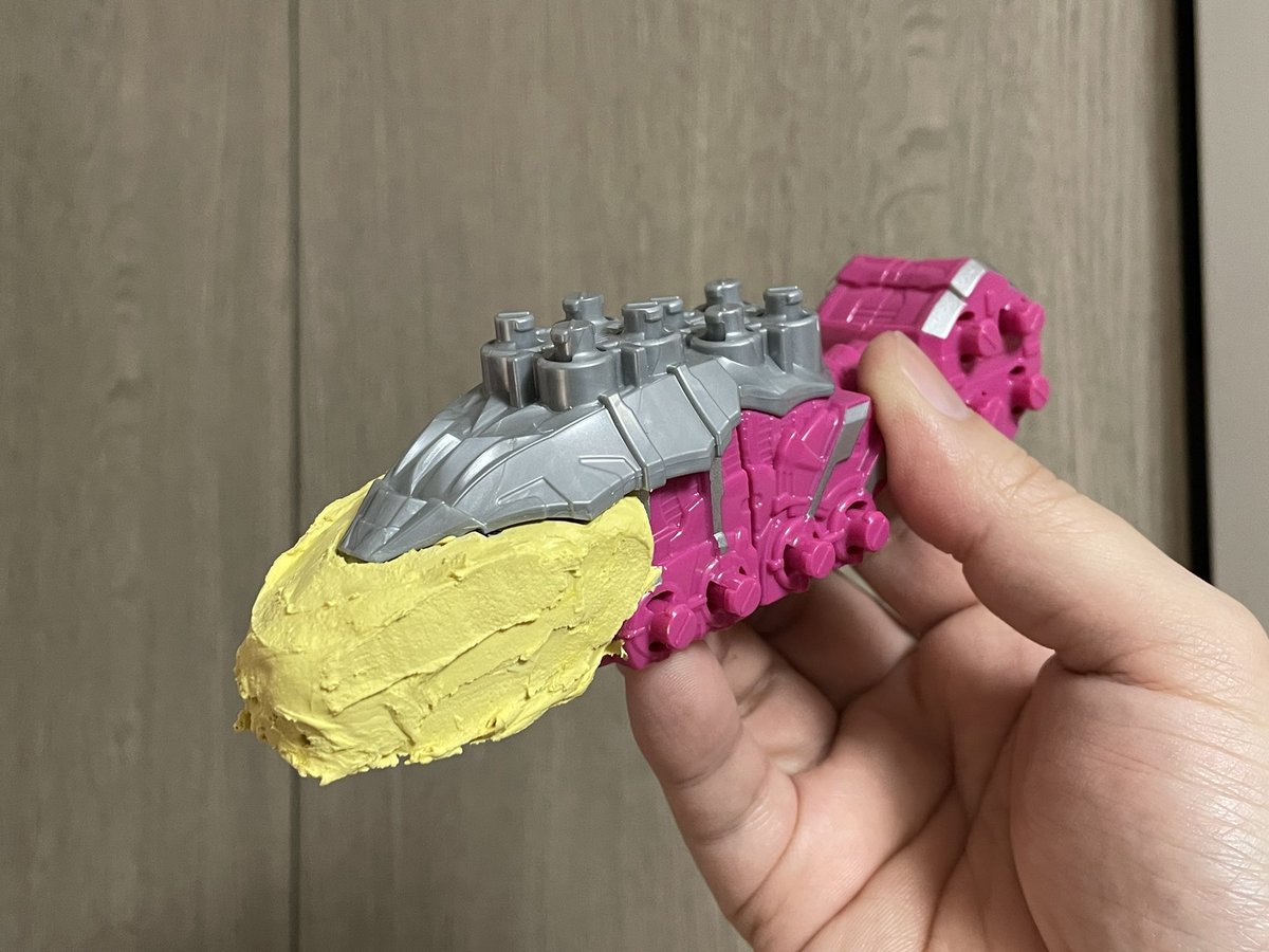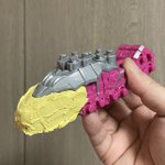 光、ミラーボール、サイリウムと来たらそりゃあ音楽が必要でしょう、という事でこの体にはビートバックルも付けるのが正装。ビームバックルの光を操る力で色が変わって見えます。 …という体で同色で。目は強い光から目を守るためにサングラス色に。 #ニチアサフィギュア改造部