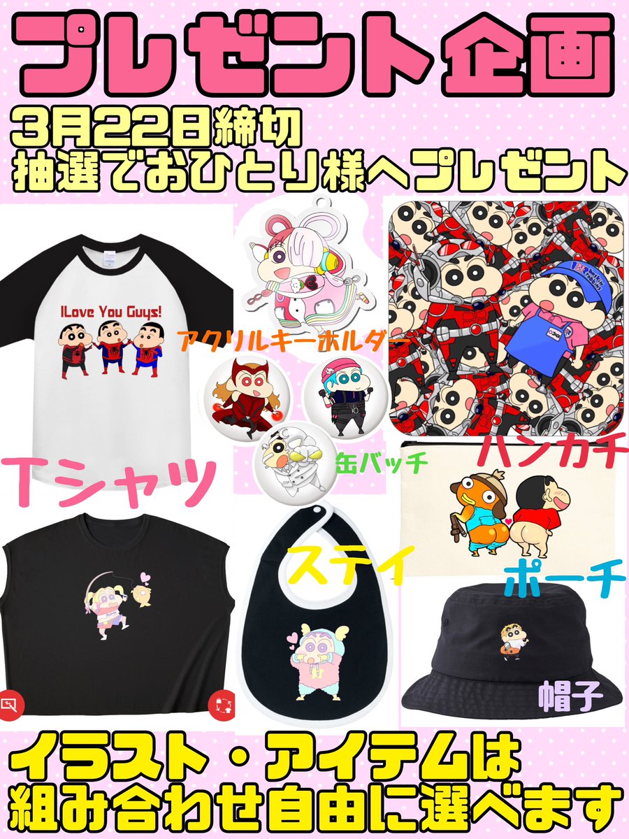 私が描いたクレヨンしんちゃんコラボイラストのグッズを抽選で1名様にプレゼントします🍑💕 ※販売はしません 応募方法は👇🏻 ■このアカウントをフォロー ■この投稿をRT(引用でもOK) ■YouTubeのチャンネル登録 youtube.com/@Fucharaty ※抽選は3月22日の22時 ※お届けまでには2~3週間かかります