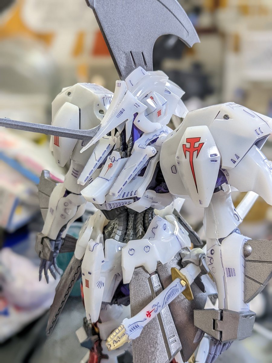 2 3 HGエルガイム完成だよ。 主な改造点は肘関節をイエサブパーツに交換してガワラ曲げ可能に・腹ブロックで数ミリ延長・右手をバスターランチャー持ち手に改修してネオジム磁石で保持などなど。ボディカラーはクレオスのブリュンヒルトホワイト。 #HBDのんちゃん #ノゾミスト模型部 23/07/01 13:34