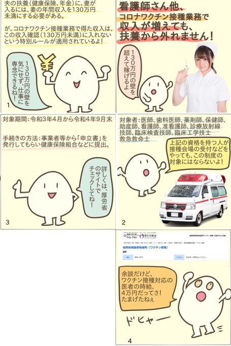 #看護師さん 等、医療職の方が #コロナワクチン接種 業務でいくら稼いでも #扶養 から外れないよ~って制度の延長が決まりました。#扶養内 #扶養控除 #漫画 #マンガ #Web漫画 #コミック #comic #日常漫画 #漫画好きな人と繋がりたい #漫画好きと繋がりたい #漫画が読めるハッシュタグ
