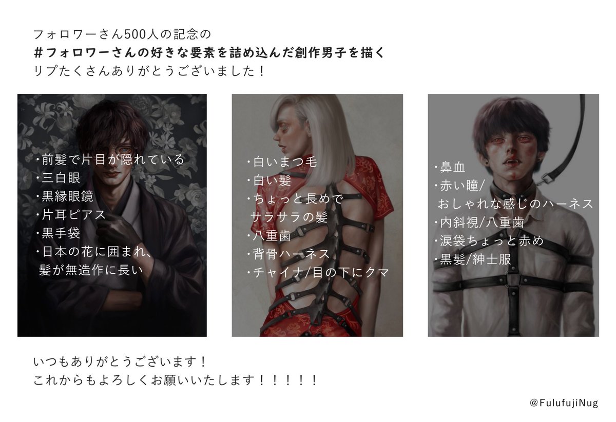 フォロワーさん500人記念の #フォロワーさんの好きな要素を詰め込んだ創作男子を描く いただいた要素から三人描きました! 改めて本当にありがとうございます🙇これからもよろしくお願いします…