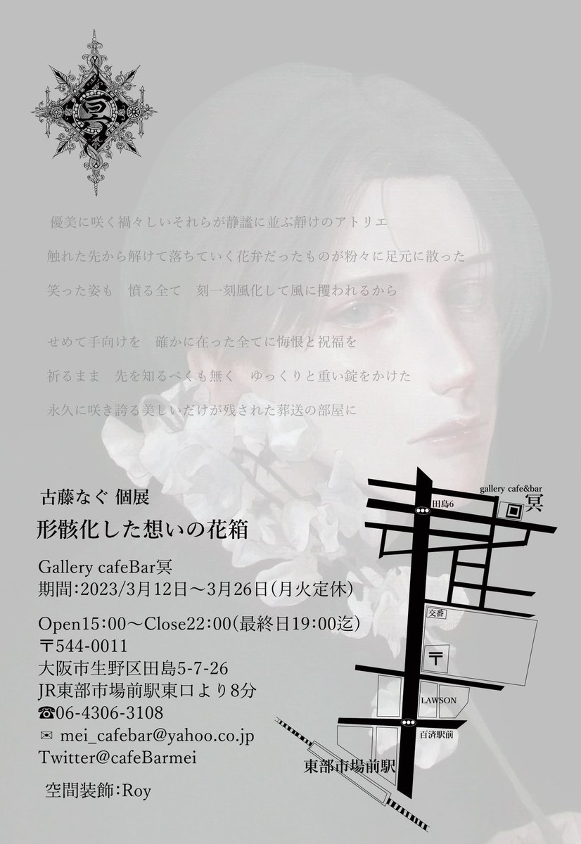 【個展のお知らせ】 「形骸化した想いの花箱」 場所 Gallery cafeBar冥 #cafeBarmei 大阪市生野区田島5-7-26 会期 2023.3.12 - 3.26 (月火定休) 時間 15:00 - 22:00 (最終日19:00迄) 冥さんでは初となる個展です…!新旧10点ほど作品展示/販売予定です💐どうぞよろしくお願いいたします。