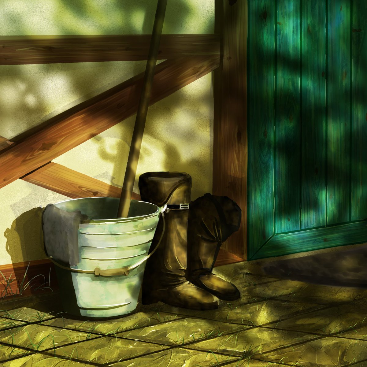 描きました。 『木漏れ日の玄関』 木目と木漏れ日が上達しました!