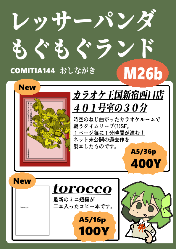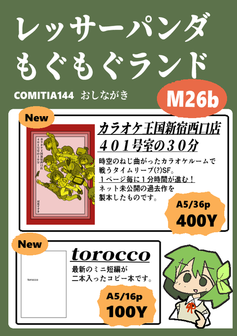 20 91 【おしらせ】 5月5日に開催されるコミティア144に、サークル「レッサーパンダもぐもぐランド」で初参加します ネット未公開の過去作で、「1ページに1分ずつ時間が進む」という設定の30ページくらいの時間モノSFを出すので K I T E N E 双葉すずきより 23/04/11 17:02