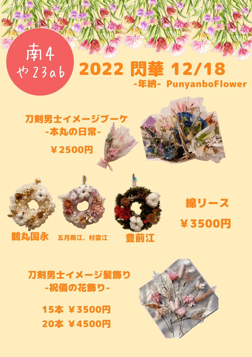 【サークル参加します!!】12月18日(東京)COMIC CITY SPARK 17内 閃華の刻 40 -年納-| #イベントGO_赤ブー akaboo.jp/event/item/201… スペースの場所発表されてました✨ 丹精込めて作ったブーケ、リース、髪飾りなどを持って行きます!!! よろしくお願いします🙇♀️ 【⠀南4 や23ab⠀】