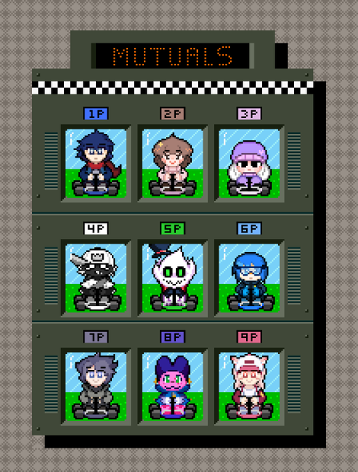 Choose your driver... 1P. @Le_Basth 2P. @Katuringa 3P. @WSpace7w7 4P. @PimFlash__ 5P. @matt_draw 6P. @Triniez_Trini 7P. @V3nturous 8P. @Ketsui001 9P. @Siro_art_UwU [#pixelart]