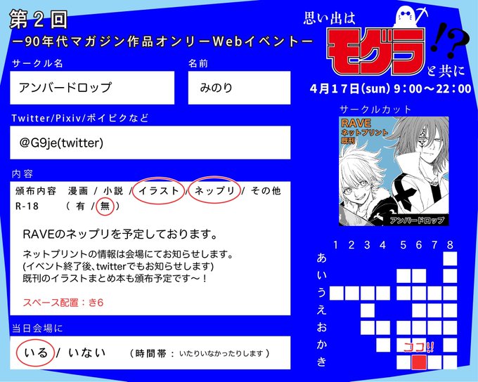 告知用テンプレートお借りしました。 4/17 webオンリーイベント参加させていただきます。 ネップリと既刊のイラストまとめ本頒布予定です。よろしくお願いします〜! #思い出はモグラと共に2
