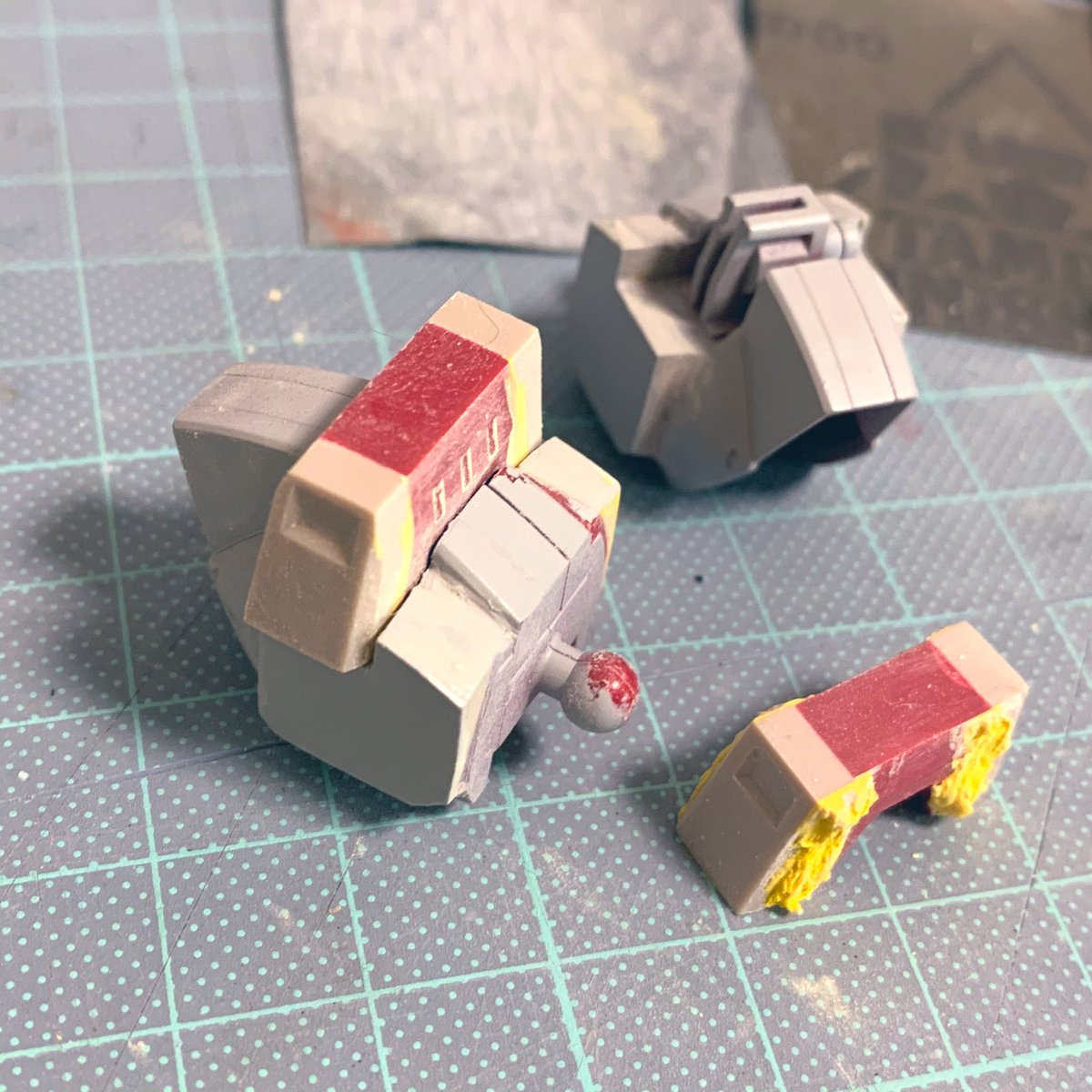 腰周り 形はビルドガンマガンダムのままで ディティールアップをちまちまと フロントアーマーの裏にプラ板貼ったり 装甲断面のスジ彫りしたり(ちょーめんどう 工作は相変わらず雑なのでアップにしちやダメなやつ!w #HGUC #リックディアス #ガンプラ