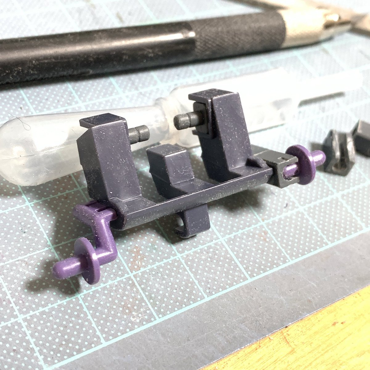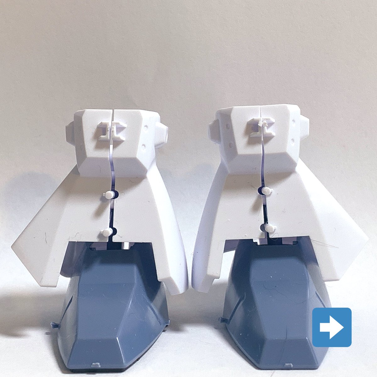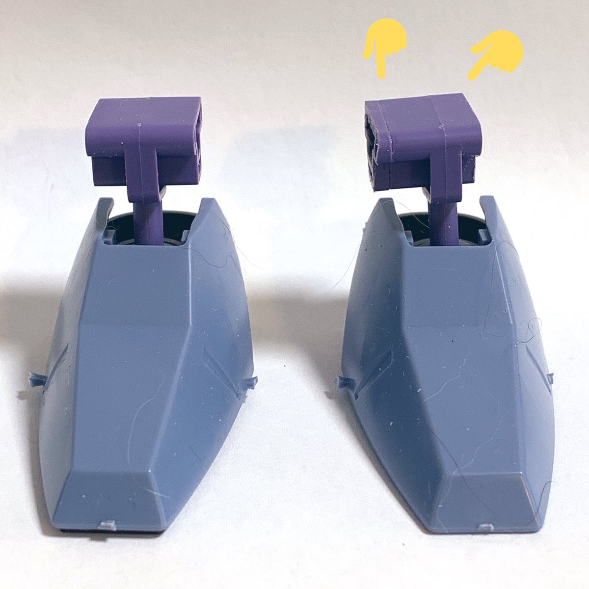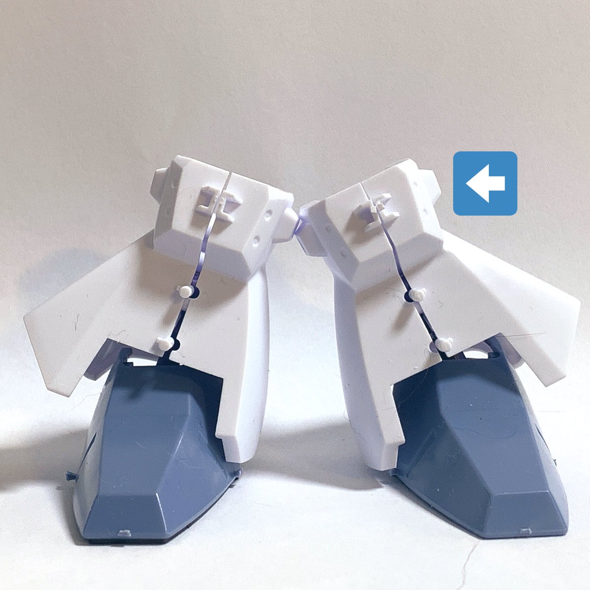 これ以上足首ジョイント延ばしてもスカスカになっちゃうので ジョイント基部の外側を2mm切り離して 内側に再接着 すねパーツ側の取り付けに邪魔なとこも削ります 足首を少し外側にずらすわけですね これでさらに内側に可動が広がります #HGUC #リックディアス #ビルドガンマガンダム #ガンプラ