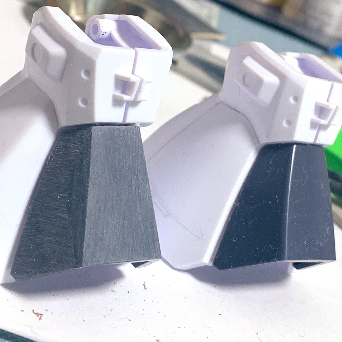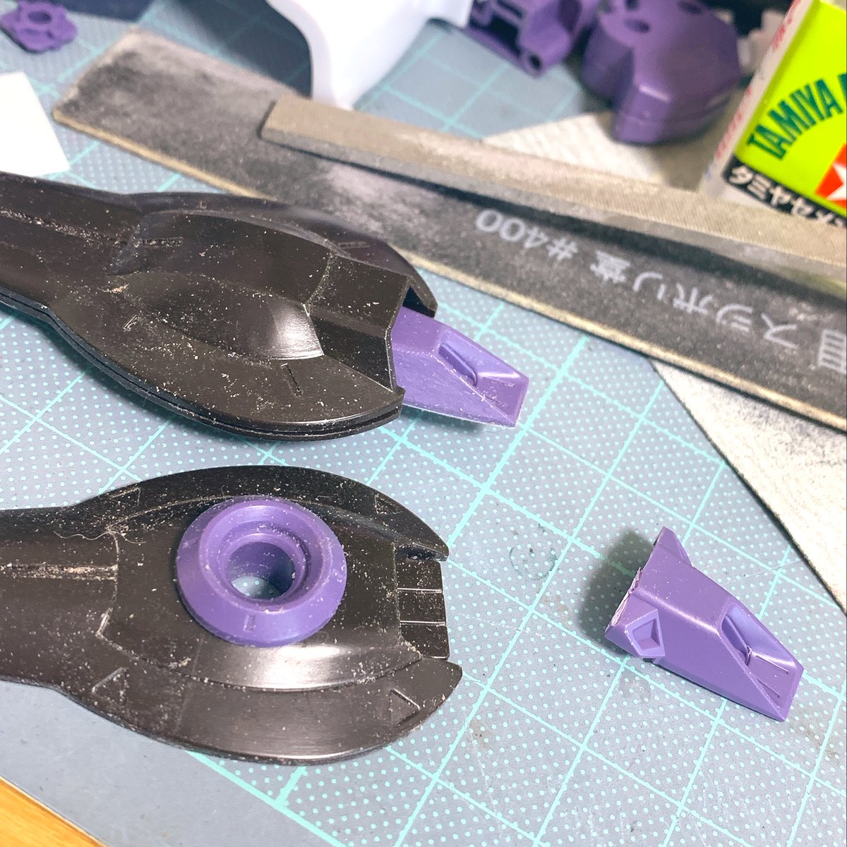 0 1 これ以上足首ジョイント延ばしてもスカスカになっちゃうので ジョイント基部の外側を2mm切り離して 内側に再接着 すねパーツ側の取り付けに邪魔なとこも削ります 足首を少し外側にずらすわけですね これでさらに内側に可動が広がります #HGUC #リックディアス #ビルドガンマガンダム #ガンプラ 20/04/09 16:19