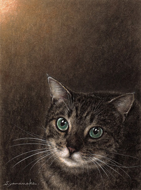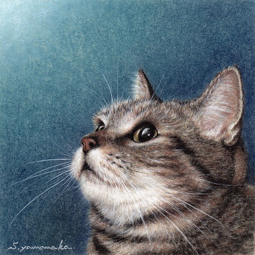 先日終了したばかりの聖路加個展の直前にお届けした新作肖像画のご紹介です。 モデルはアメショーの ”みう ちゃん“ 。依頼者Sご夫妻の奥様のご実家の猫さん。 擦筆彩色画法で、背景は明るい青・・・とのご希望に副って描かせていただきました。 『 明日の光 』 パステル(擦筆彩色)14cm×14cm