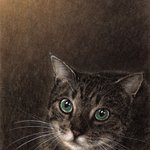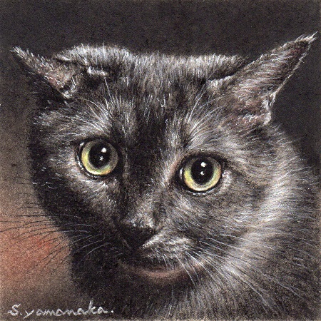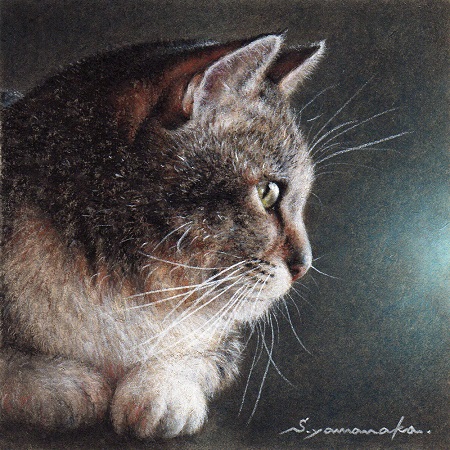 6 122 8日から始まる「猫の肖像展」に出品する4点目のご紹介です。 既にご紹介した3点(擦筆彩色画・細密画・ペン画)に加え、墨とパステルによるラフタッチで遊び心満載で描きました。 これで4種類の描法で描いた作品を同時にご覧いただけます。 『 まなざしの先に・・・』 墨+パステル 21cm×16cm 22/07/06 00:27