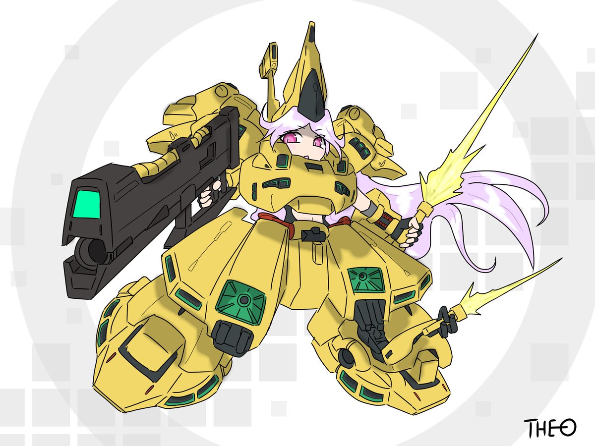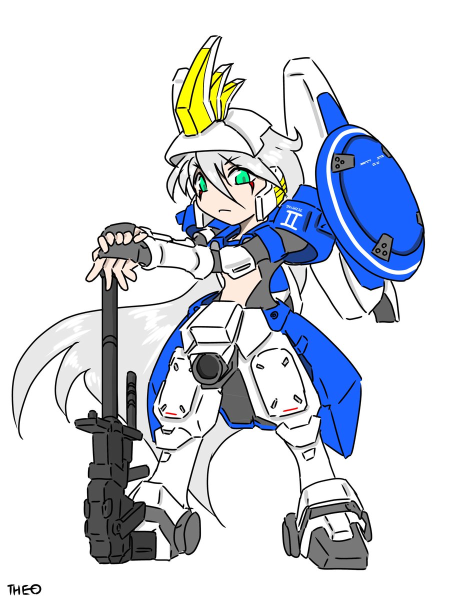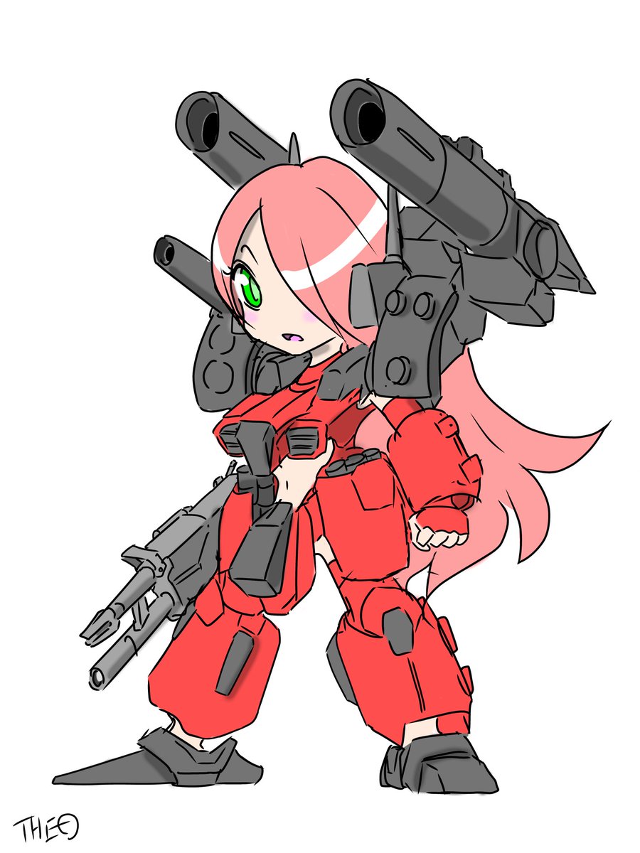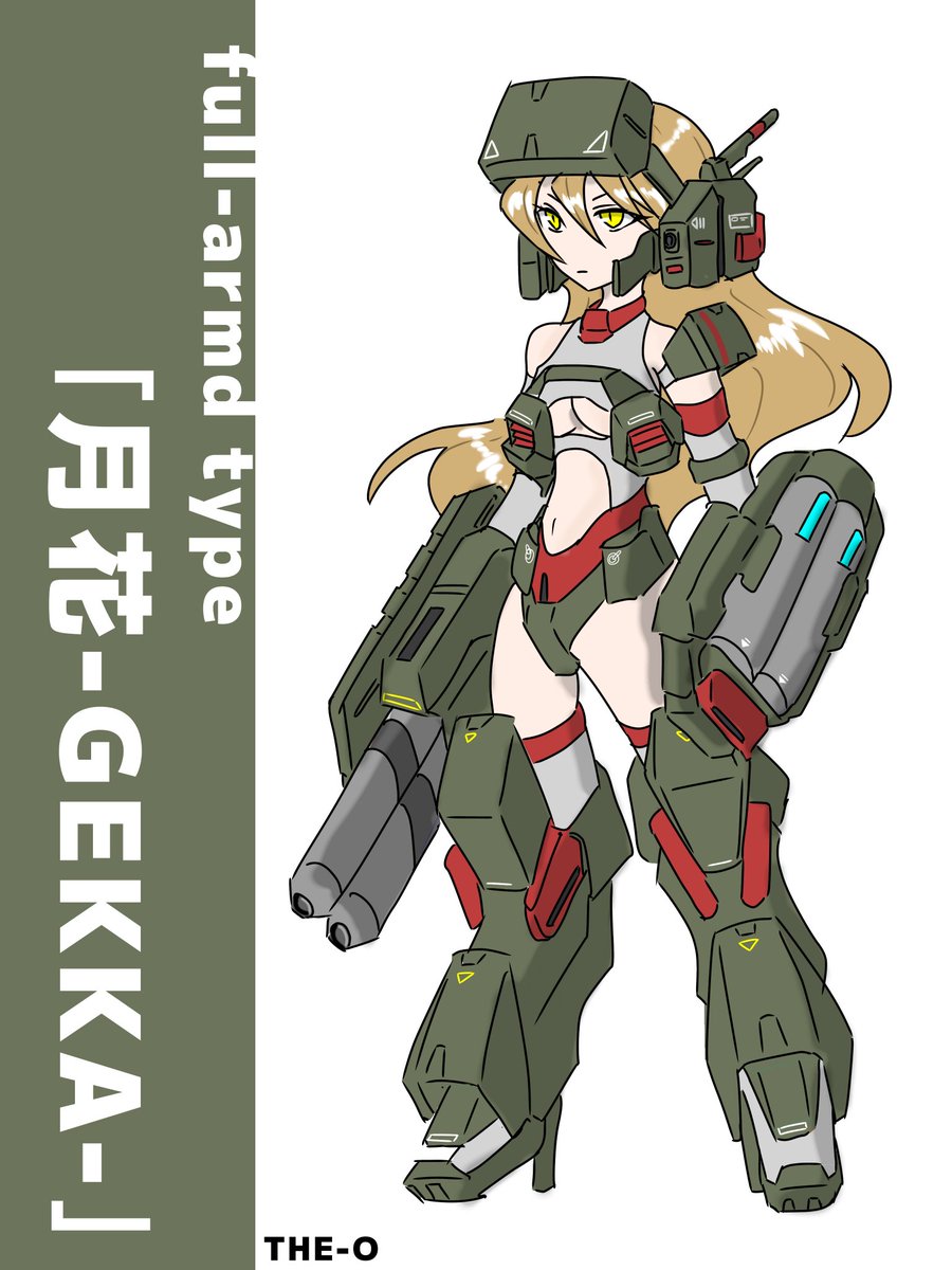 オリジナルメカ少女 full-armd type『月花-GEKKA-』 月花ちゃんロールアウトです⭐ 左手のエネルギータンクの先の赤い部分を右手の2連装ビームキャノンの穴の部分に差し込む事でフルチャージショットが可能になるという仕様ですw(*´艸`) #オリジナルキャラクター #創作イラスト