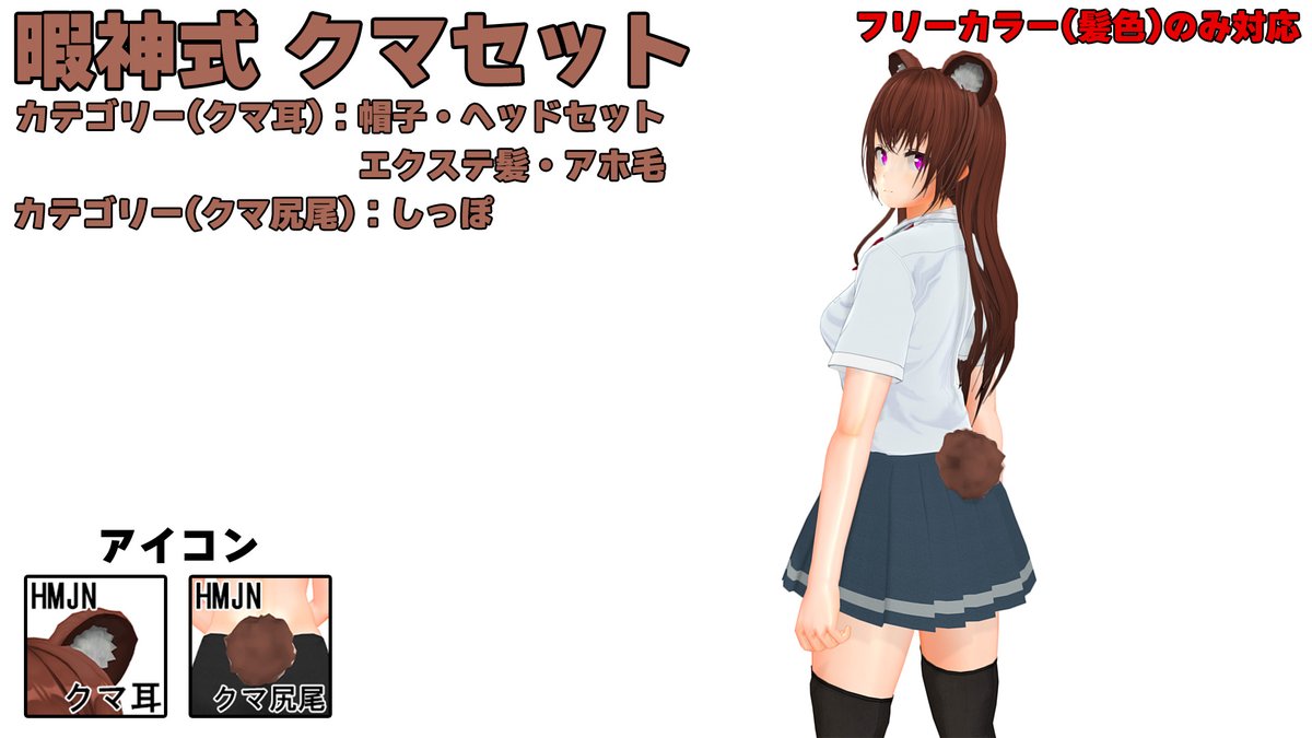 「暇神式 クマセット」配布開始 クマ耳とクマ尻尾のセットです。 耳は帽子・ヘッドセット・エクステ髪・アホ毛に、尻尾はしっぽカテにそれぞれ追加されます。 髪色フリーカラーのみ対応。 ux.getuploader.com/himaupl/downlo… #COM3D2 丼COM3D2