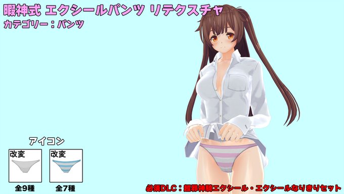 「暇神式 エクシールパンツ リテクスチャ」配布開始 公式DLC「超昴神騎エクシール・エクシールなりきりセット」が必要です。 上記DLCに付属してるパンツをリテクスチャした普通のパンツです。 無地と縞パンの2パターン、合計16種。ずらし対応済。 ux.getuploader.com/himaupl/downlo… #COM3D2 丼COM3D2