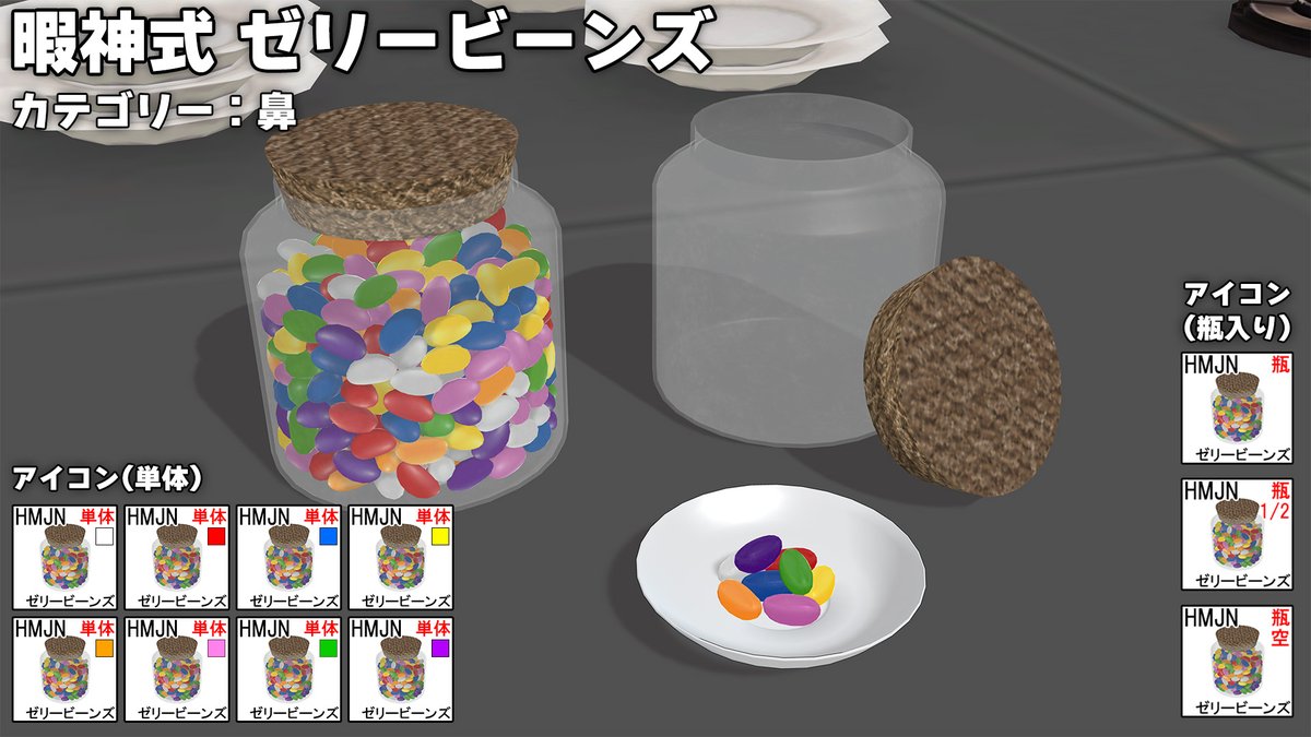 「暇神式 ゼリービーンズ」配布開始 これが大好物な元大統領が居るくらいアメリカとかでポピュラーなお菓子。 鼻カテに追加されます。 瓶入り(3差分)と単体(計8色) 瓶の蓋はボーンで動きます。 ux.getuploader.com/himaupl/downlo… #COM3D2 丼COM3D2