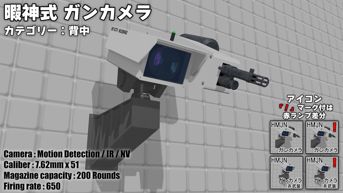 「暇神式 ガンカメラ」配布開始 某ステルスゲーに出てくるような機銃付きの監視カメラです。武装なし版もあります。 カメラはパーツエディットで好きな向きに動かせます。 クラブの入り口、エンパイア叔父の枕元など好きなところに置きましょう。 ux.getuploader.com/himaupl/downlo… #COM3D2 丼COM3D2