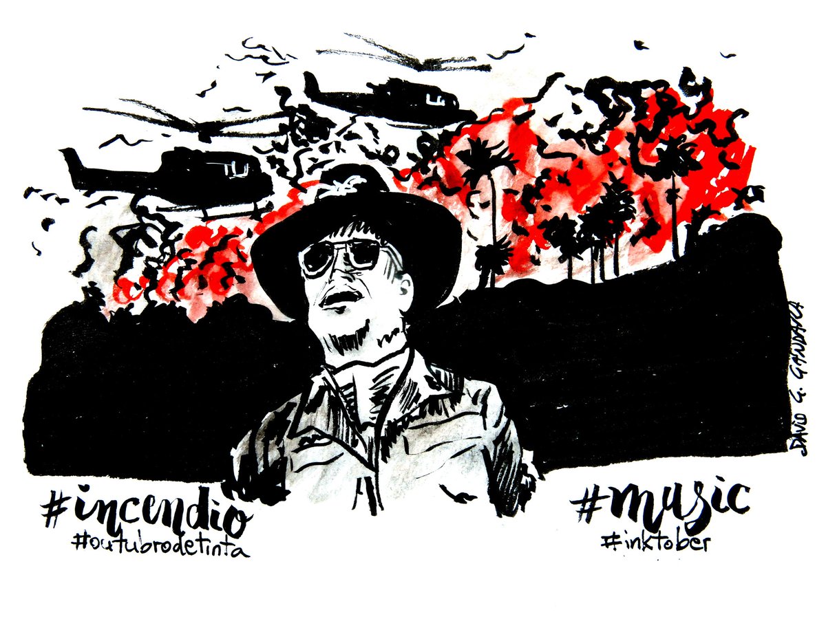 Día 27 do #outubrodetinta #inktober2020 por @mr_rookes As palabras son #incendio e #música. Automaticamente lembrei ó coronel Kilgore @PortalPalabras @AcademiaGalega @FundacionBarrie #Ollaapalabradodía