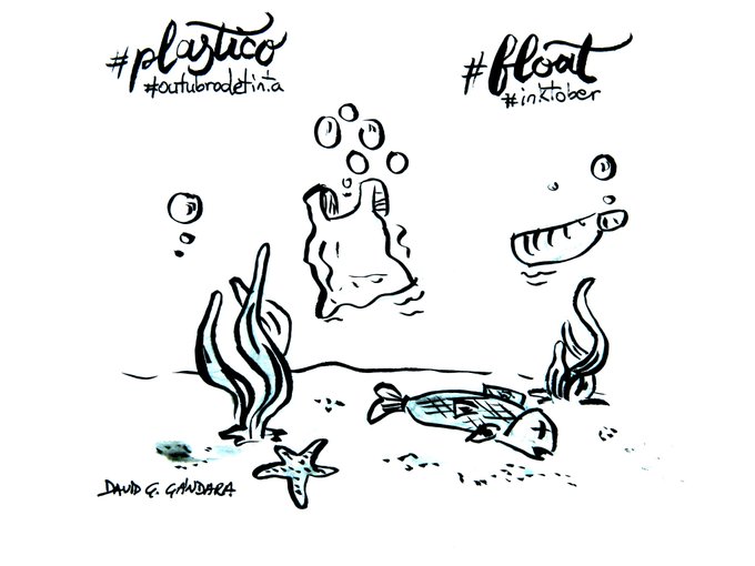 Día 28 do #outubrodetinta #inktober2020. As palabras son #plástico e #float. Ás veces flota o que non debe e non flota o que si debería! @PortalPalabras @AcademiaGalega @FundacionBarrie #Ollaapalabradodía