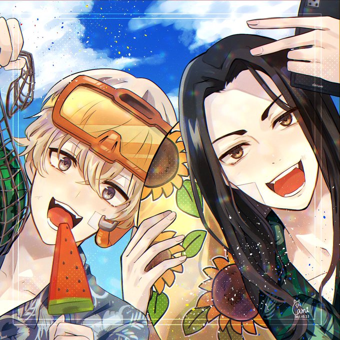 【イベントネタバレ注意⚠️】 🎲「やっぱ俺は釣りの才能があるってことだな!」 🐴「木の棒で坊主食らってた奴が調子のいい事言ってんなよ…」 最終的に釣り道具を借りて今晩の食材にありついててらいいなー。 #ヒプマイファンアート