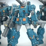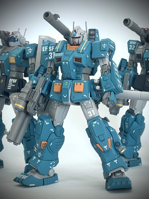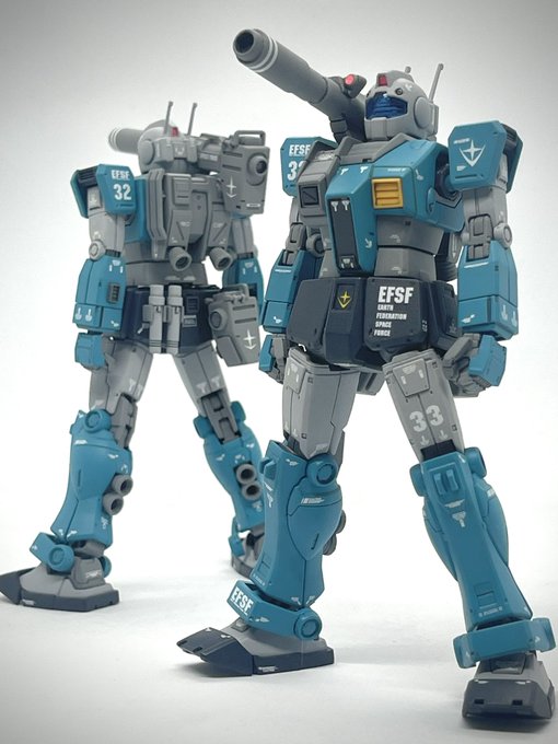 #誰にでも自分だけのグフがある #キリー・ギャレット 率いる飛行試験小隊(if) 飛びグフは左右腕ガトリングユニット、外脛の小型化(内脛使用)、ロケット砲のモジュール化 塗装はピンクサフ×グレーサフ