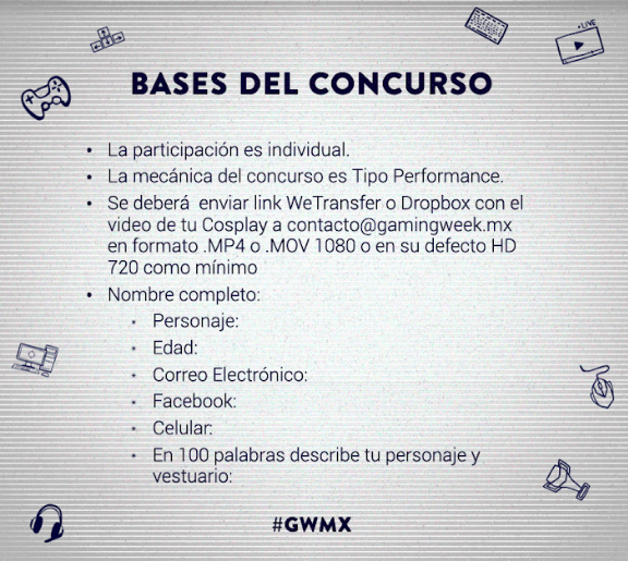 Es tiempo de representar a tu personaje favorito de videojuegos. ¿Ya tienes tu #cosplay listo? El premio al primer lugar es de $8,000 MXN. ¡Participa! t.ly/Gamingweek Tienes hasta el 26 de octubre para enviar tu video.