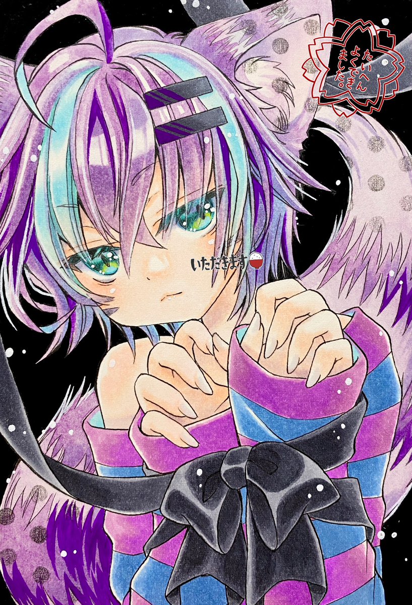 #グラッドアリス展2 (ラスト)ドローイング③【ギフト🎀チャシャ猫】コピック・透明水彩・アクリル・等で塗りました。ちょっとアクリルハマるかもw今回のアリス展用原画達は色々な画材を使って描く事に挑戦☆時間はかかったけどとても楽しく出来ました。 #アナログイラスト #イラスト