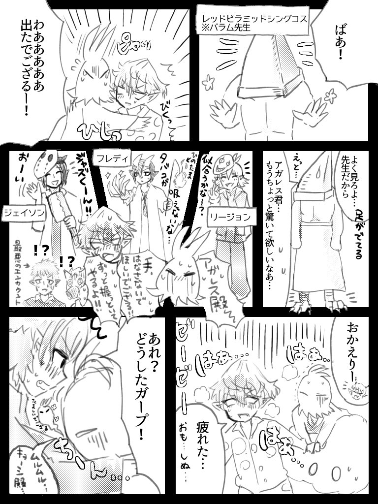 肝試しをするアガガプ漫画 ガプ君は怖がりだけどアガ君を御守りしたいという思いは本当なんです。でも何故かいつも逆にアガ君に守られてばかりになっちゃうんですけどね。 教師陣はホラゲや映画のキャラコスしてる(自分趣味)