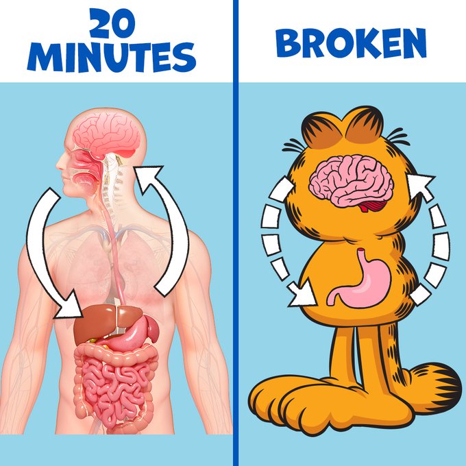 196 1805 it takes 20 minutes for the human brain to tell the stomach that it's full.... evolution skipped this part for cats 22/10/19 23:03