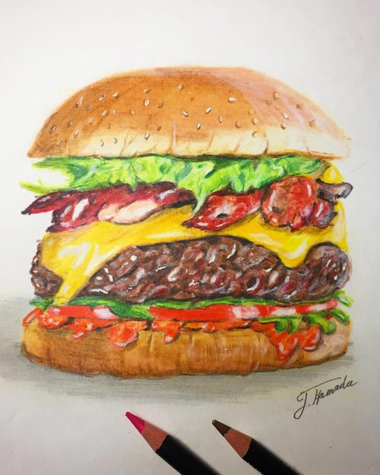 色鉛筆に挑戦! ハンバーガー描いてみました🍔😊 #色鉛筆画 #ハンバーガー