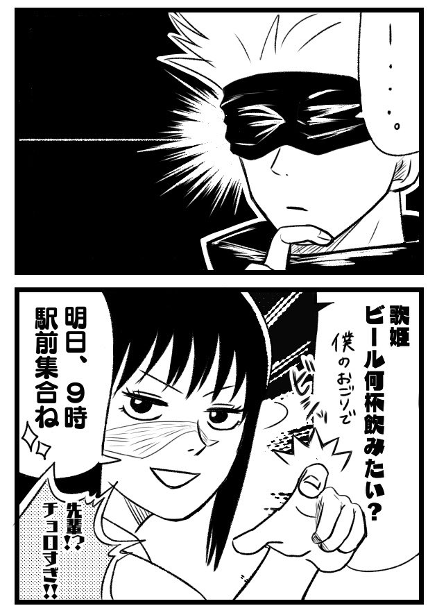 昨日の五歌のコスが最高すぎたので描かせていただきました😌 お二人共、素でこんな事やってて、見てるこっちがドキドキしました笑 最高な時間をありがとうございました🙏😇 五条→ytさん@nnnmnnmn_ 歌姫→宮柱さん@_018ch #五歌