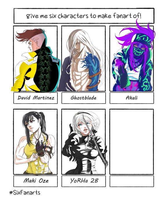 Part 5 Guys, we need one more character. Suggest a Male character so we can have equal representation 🙌 #sixfanarts #2b #NieRAutomata #fanart