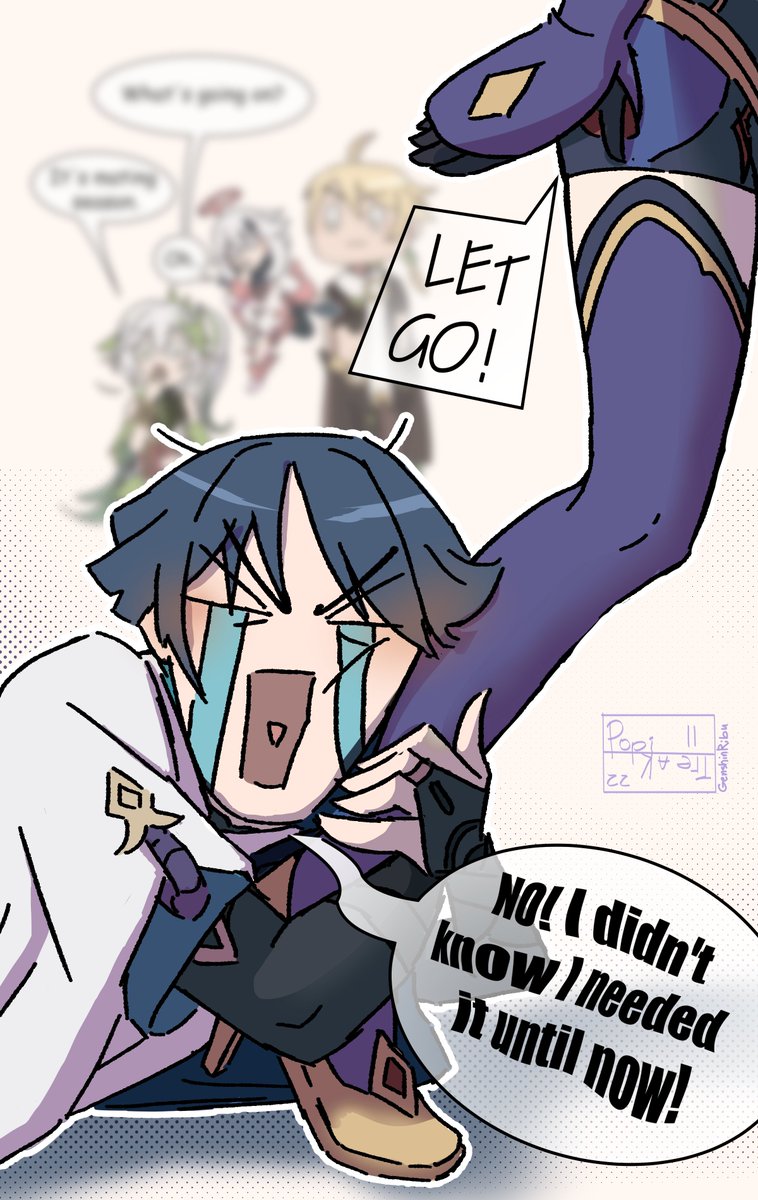 🔮: Hey. ☂️: What? 🔮: I feel tired ☂️: We just came here?!? W-what do u think ure doing?!? 🔮: Using u as a cushion! Don't u dare move an inch! *happy scara noises* can let a smile out, she can't see #scaramona #スカモナ #MonaMegistus #SCARA #wanderergenshin #mona #scaramouche