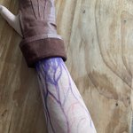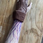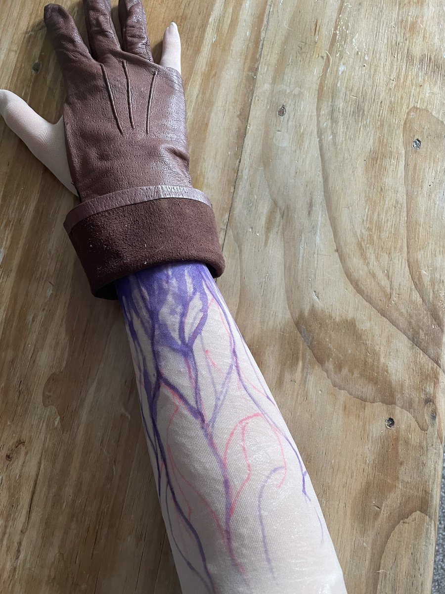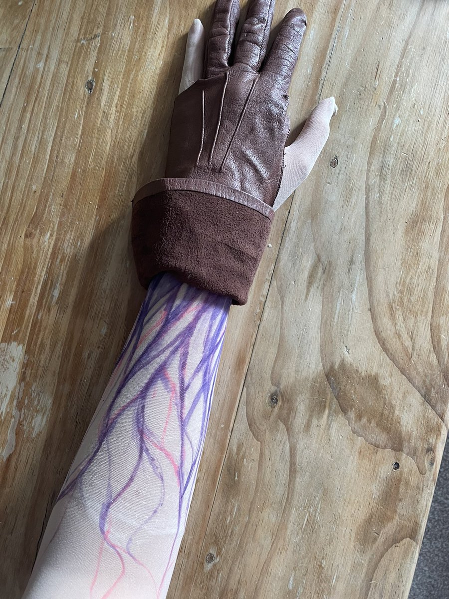 Working on the final pieces of my Imogen cosplay for MCM! Fumbling around with fabric pen on skin-coloured gloves (plus an arm smothered in cling film) #cosplay #CriticalRole