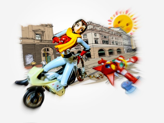#夜のフィギュア撮影会 お題「鍵」 バンプレストのキーホルダー、ゲッターロボ📸 バイクで引き回される姿がこれほど似合う玩具は無いと思う。 既出写真ですが、今夜は右上に太陽を添え「皆が笑ってる、お日様も笑ってる」ぽくアレンジしました。
