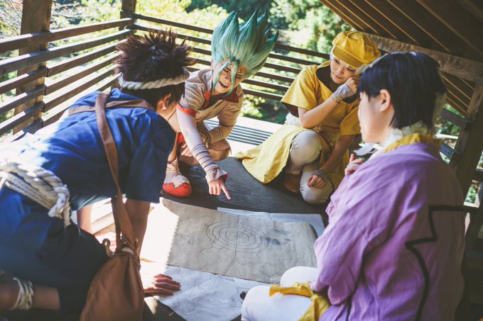 【cosplay/Dr.STONE】 STONE WORLD 科学の城 . . p📷せーやさん(@saint_arrow_pht ) 千空🚀そーたさん ゲン🃏ときるさん 羽京🏹モナさん クロム💎銀子