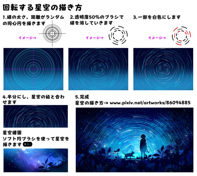 125 674 回転する星空の描き方😀 #絵描きさんと繋がりたい #イラスト #illustration 23/07/12 23:13