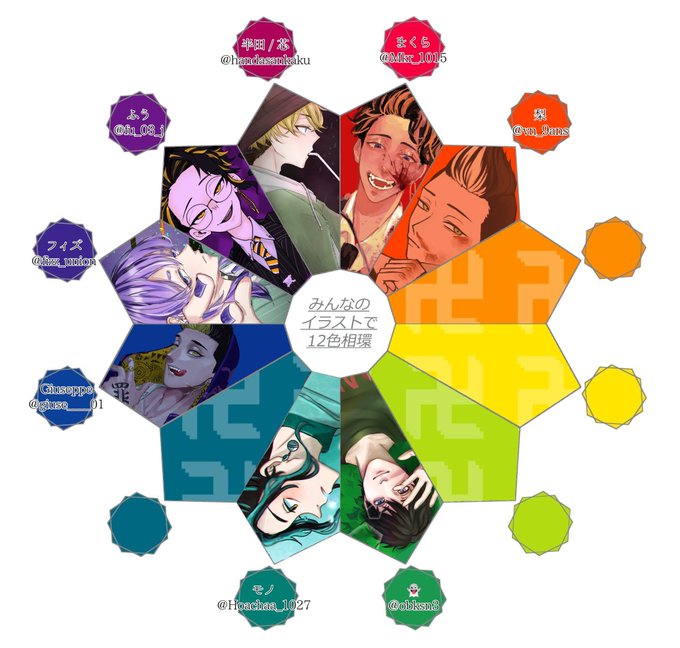 9 61 #みんなのイラストで12色相環 東リベキャラで企画させていただきました〜! 参加者さんたち大変お待たせしてしまいましたが無事完成しました‼️みんな本当にありがとう😭 参加者のみんなは🌳へ⤵︎⤵︎⤵︎ 22/02/05 15:34
