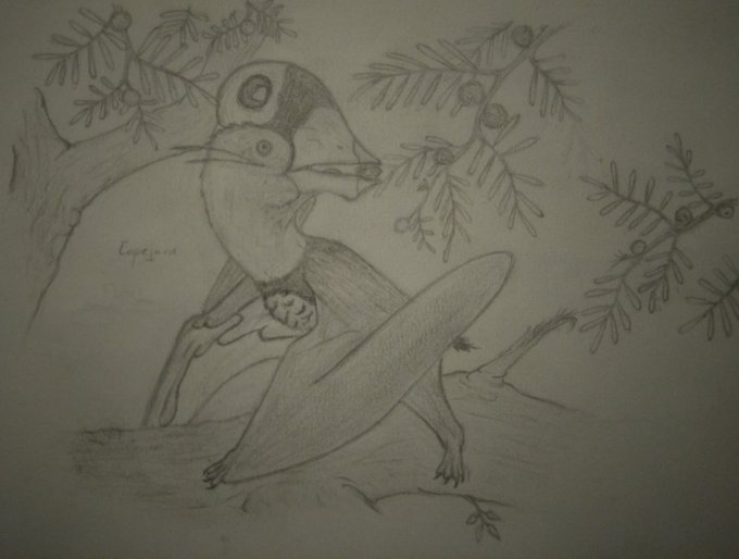 A Tapejara wellnhoferi munches on some Podozamites cones ( I think it lived with those, at least. I'm no Paleobotanist, I can't find out in which month the K-Pg extinction occured using a few lily pads and a 2 centimeter thick layer of rock ) #paleoart #dinosaurs #paleontology