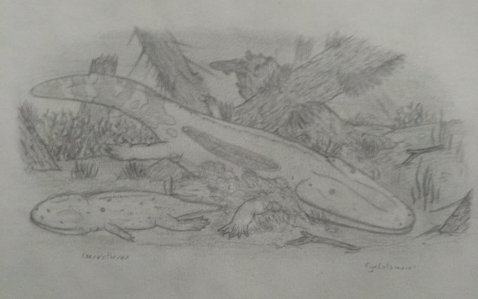 Gerrothorax pulcherrimus evading an attacking Cyclotosaurus robustus. #paleontology #paleoart Also, that tweet down there needs 75 likes or something or else I won't get a Bahariasaurus skeletal with all the known specimens in it, and I want that, I want that a lot. twitter.com/MBL_13b/stat…