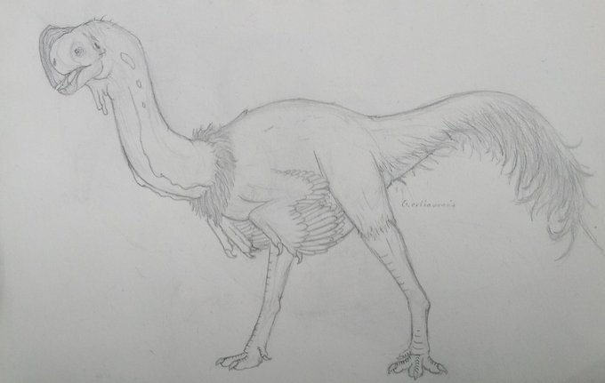 I finished drawing this Gigantoraptor erlianensis three days ago, but forgot to take a picture twice, and then it was already dark yesterday and my phone's camera is completely terrible. Anyway, I like this one a lot, its size is impressive. #paleoart #dinosaurs #paleontology