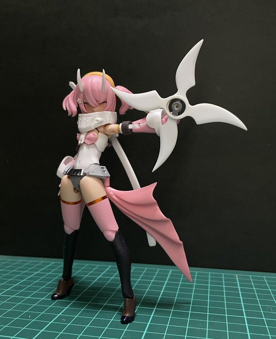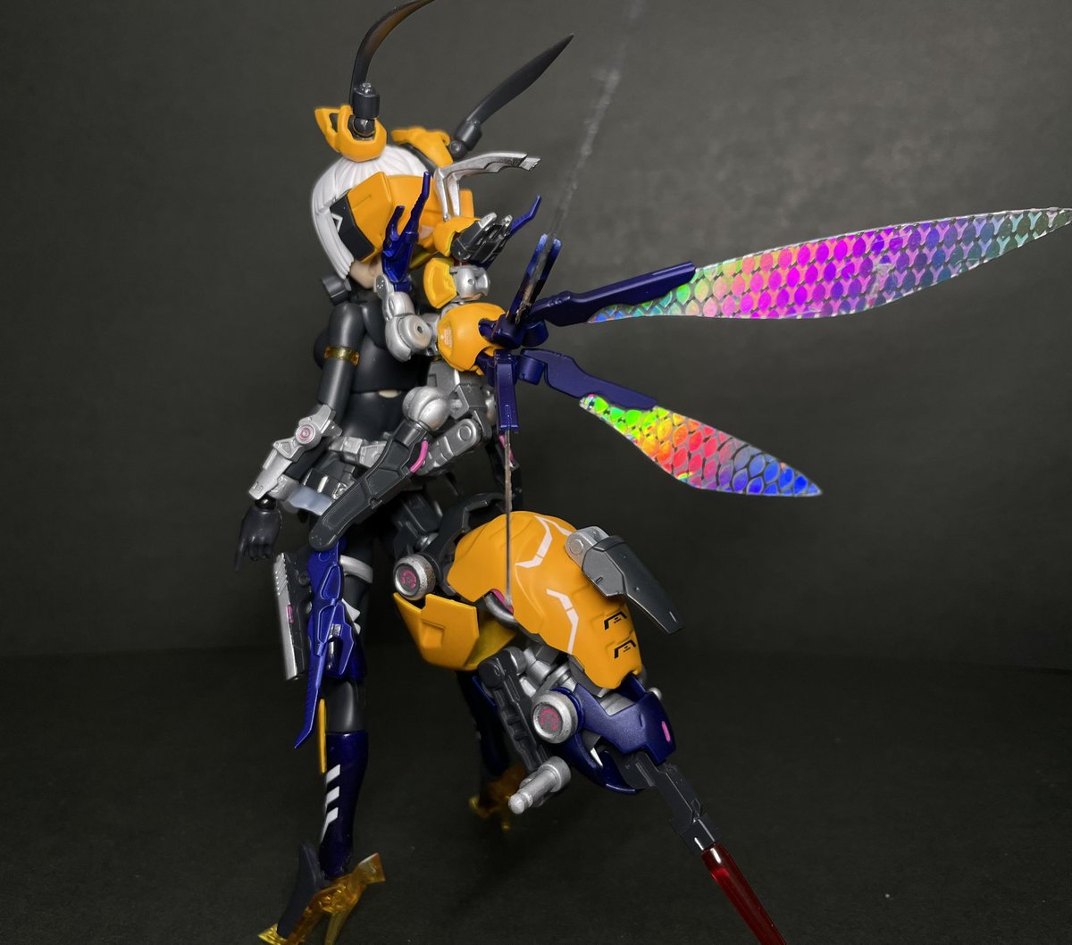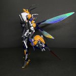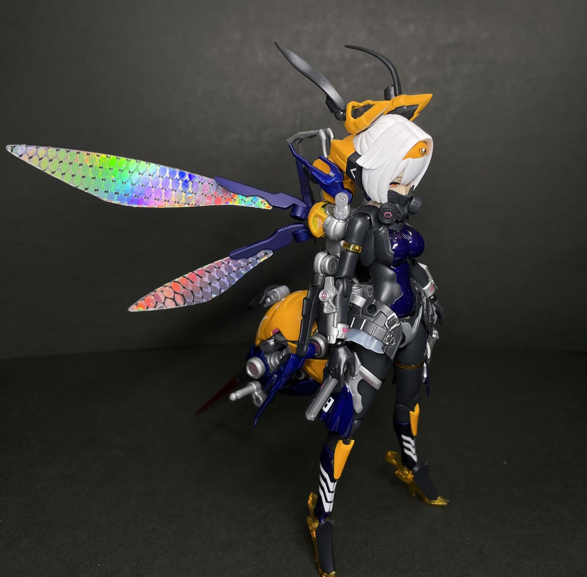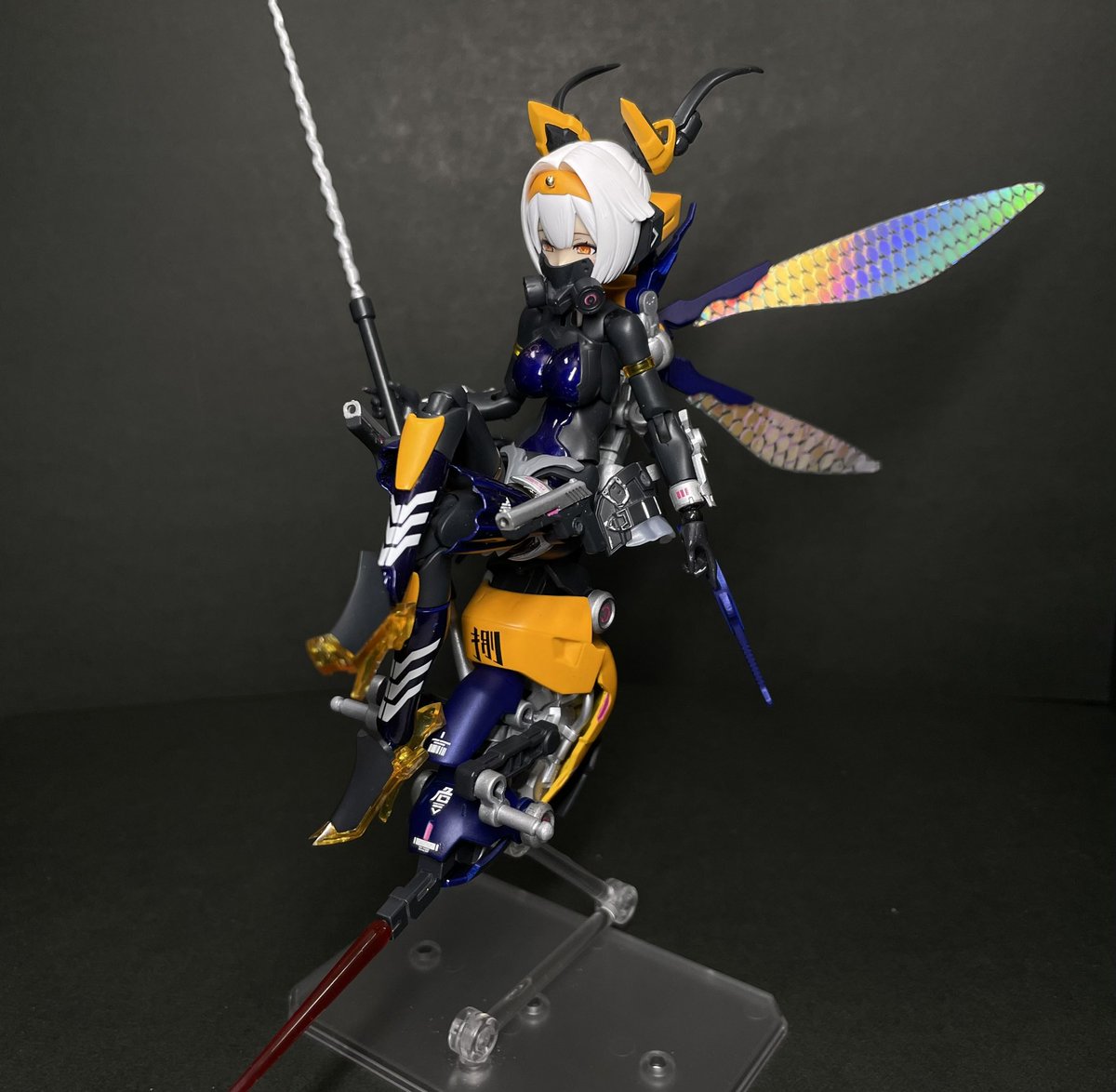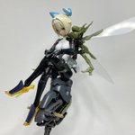 119 338 #メガミデバイス #ヘキサギア 特殊任務部隊所属 蜂呀 蜂刃🐝 弓兵とメッサーフロートを使用して製作しました 合体と搭乗出来るようにメッサーフロートを大型化 蜂呀はピッチリスーツな感じとマスクでシンプルにしてます 武器は2丁銃とチクチクしそうなランス (1/4) 23/03/21 14:55