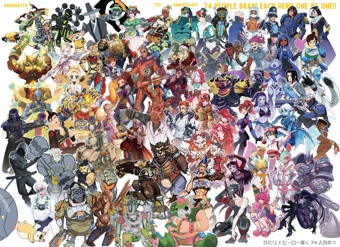 74 people draw each hero ONE BY ONE!! 7周年のお祝いに、74人で合作しました! ヒーローが2人ずついます😎 参加メンバーはツリーに↓ OW7周年、おめでとうございます🥳! #Overwatch2 #OverwatchFanart