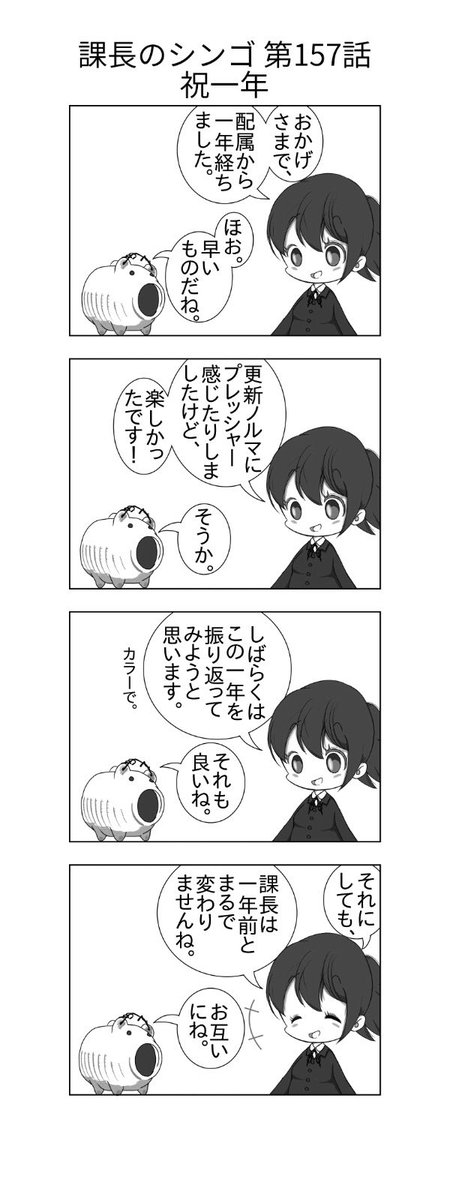 5 8 WEB4コマ 課長のシンゴ 第157話 祝一年 再掲 第1話 課長のシンゴ おかげさまで1年間続けることが出来ました。 2年目は過去絵のカラー化に挑戦しようと思います。 宜しくお願い致します。 20/02/28 07:08