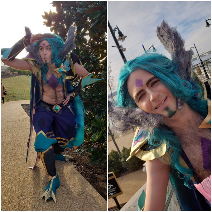 Look at this beautiful bird-man! 😍 I love how shiny Star Guardian Rakan is! And I'm so glad we got his tail added to the cosplay before Katsucon - it's super pretty, even if it does get mostly hidden by the wing feathers 😂 #cosplay #leagueoflegends