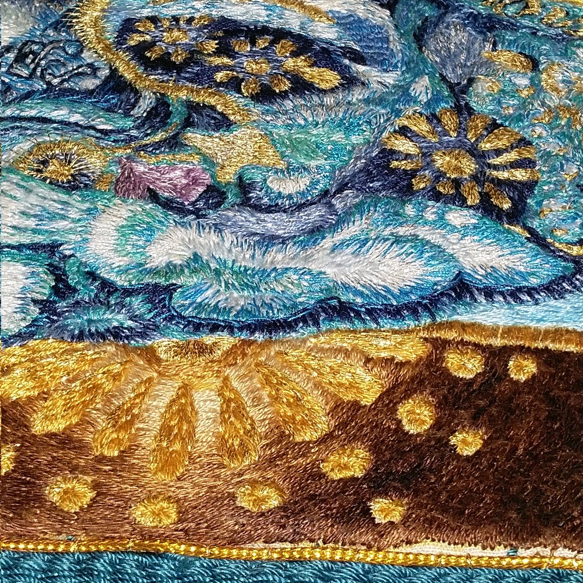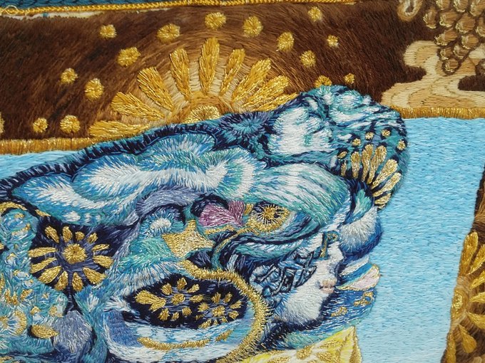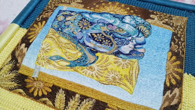#私の個性はきっと誰かにささる 『ウクライナの空』の一部 錦糸銀糸、織り交ぜて使用してます(,,^^,,)/ 今年(2022年)の作品。 完全オリジナル #手刺繍 #ハンドメイド好きな人と繋がりたい #RTで作家さんの世界を広げるタグ
