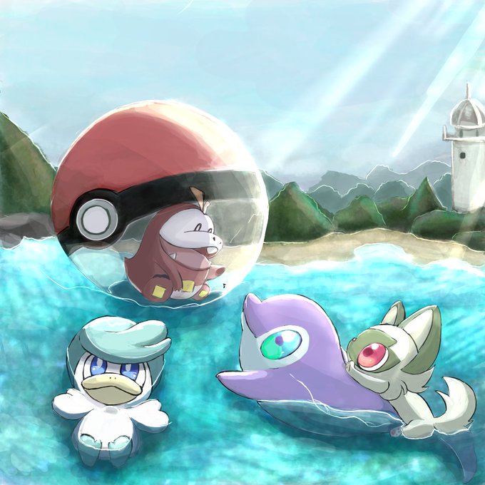ホゲちゃんだって海に入れます(?)皆で楽しく海水浴 ……これはどこまで頑張ったらいいのだろう( ˙꒳˙ )? #ポケモン #ポケモンイラスト #イラスト