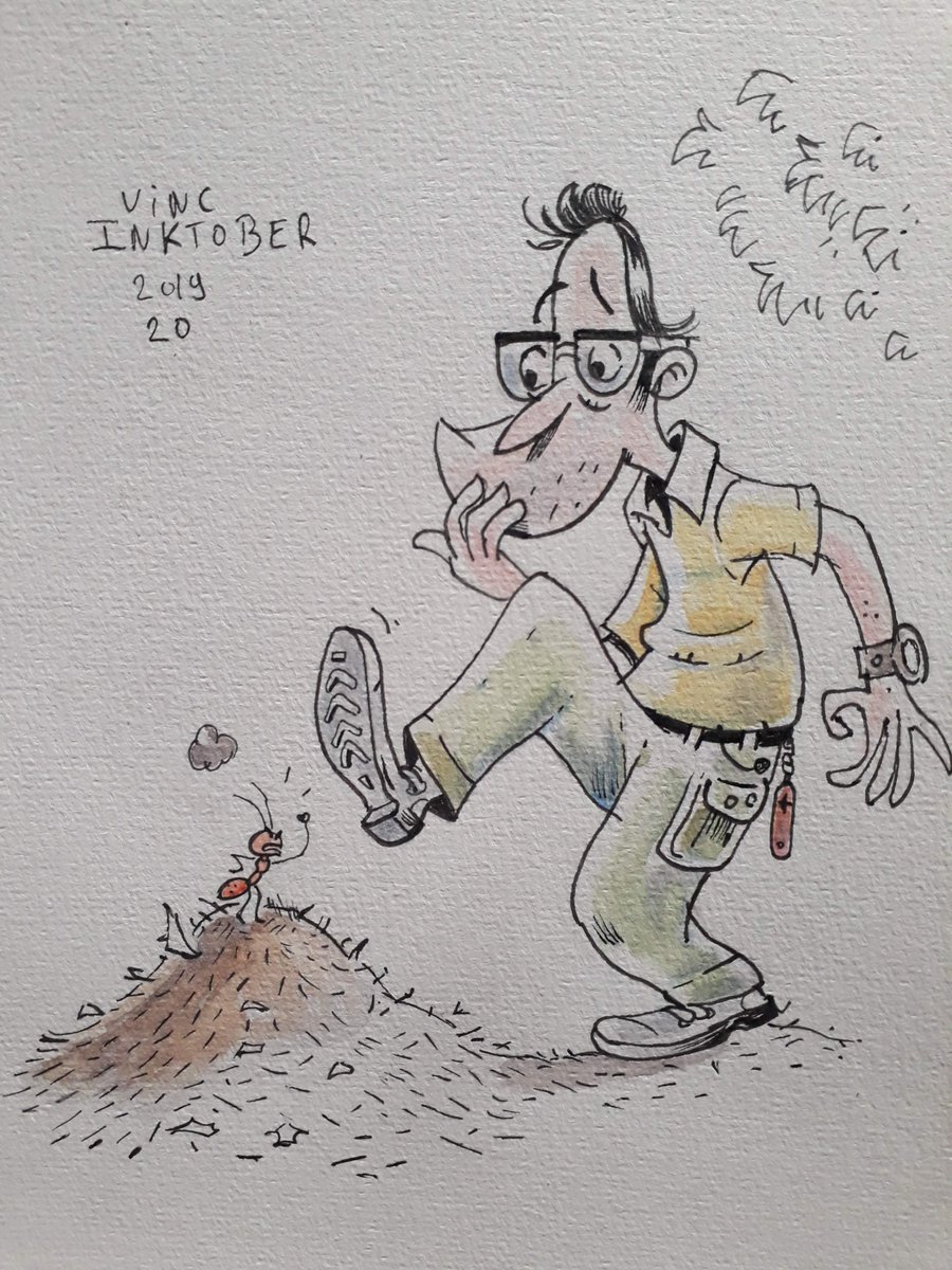 #inktober2019 Thème du jour #marcher/fouler, pas trop inspiré, je regarde en anglais : #tread... ce qui signifie : bande de roulement... bon, marcher/fouler c'est bien finalement #Inktober2019day20 #inktober2019tread #drawingchallenge #art #drawing #ink #cartoon #ant