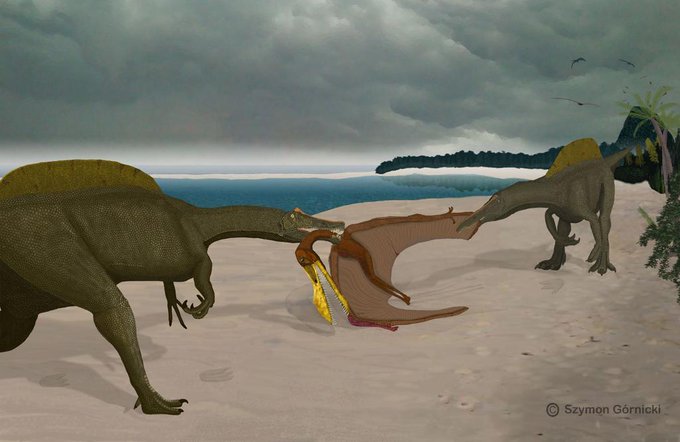 Older work (2016). Speculative Irritator reconstruction and alternative scavenging scenario to Kellner (2004) hypothesis on 3 pterosaur neck vertebrae with a spinosaurid tooth. #paleoart #Palaeoart #Paleontology #Palaeontology #Irritator #pterosaur #paleosztuka #spinosarid #art